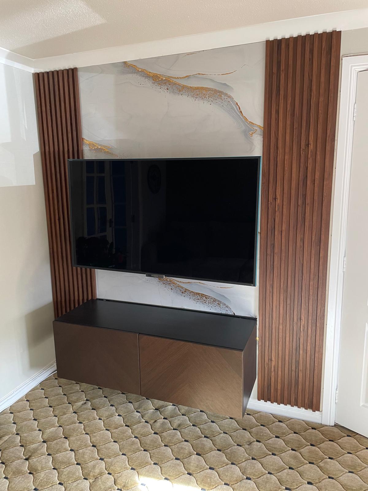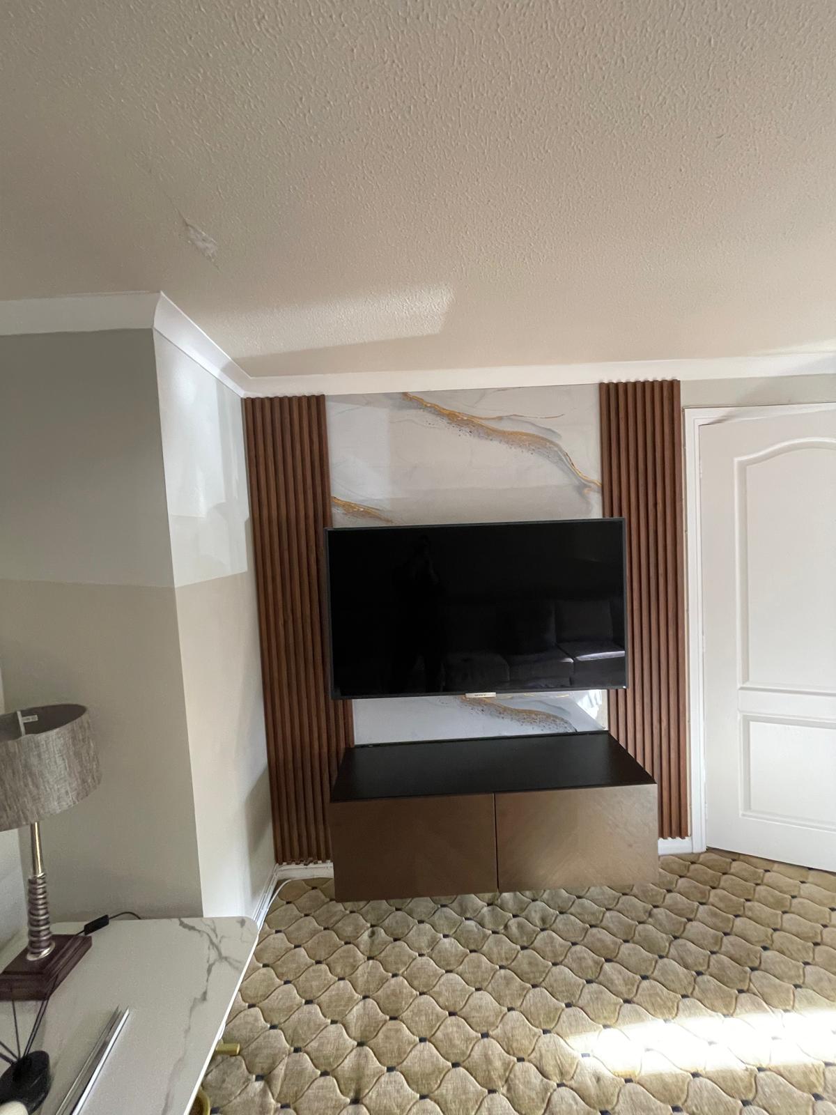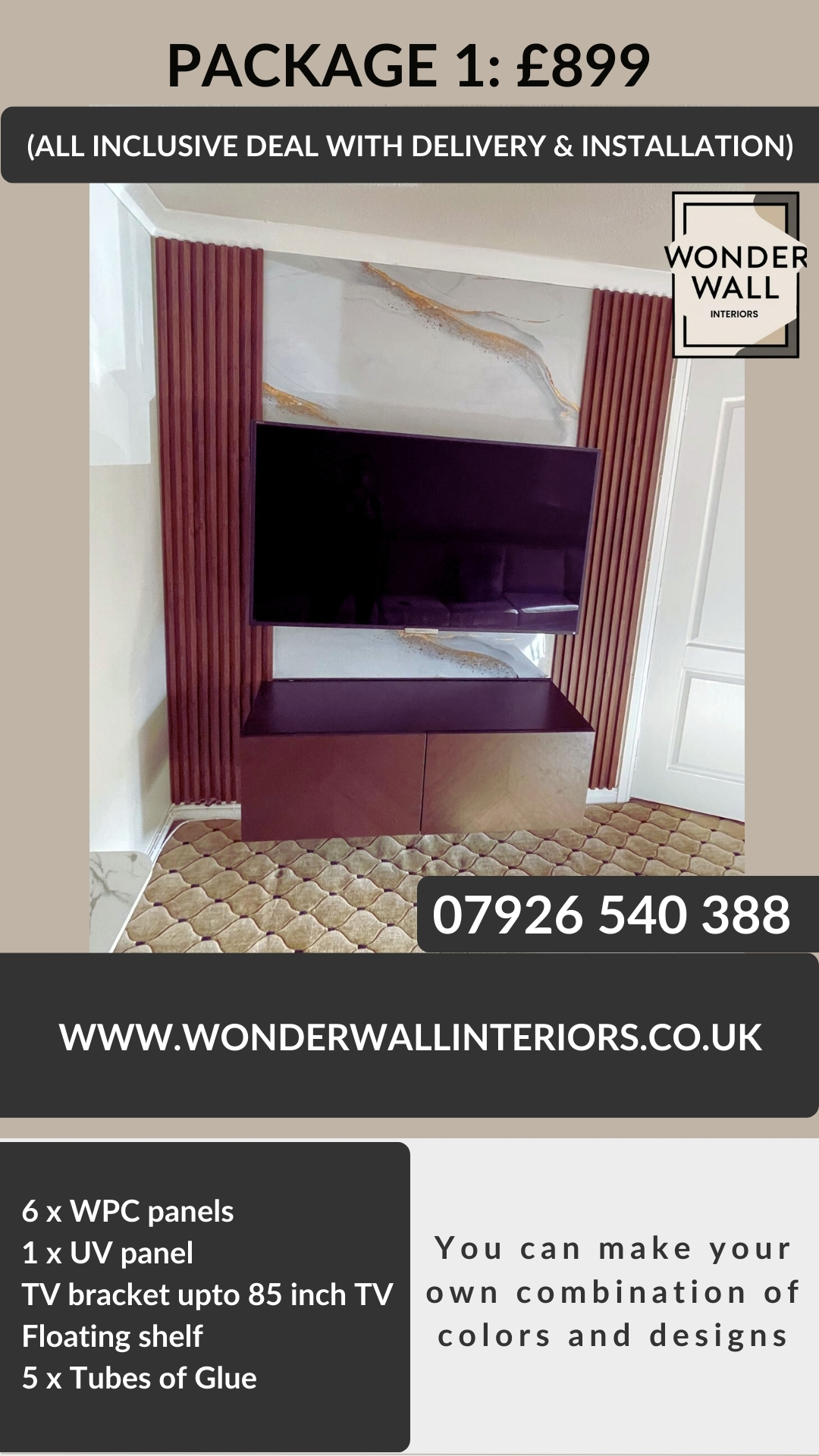 ALL OVER SCOTLAND | ALL INCLUSIVE PACKAGE: PRODUCTS, DELIVERY & INSTALLATION (Subject to T&Cs and Availabilities)WhatsApp us on 07926 540 388 to confirm your Custom Design for any queries. Package 1: £899 (All Inclusive Deal with Delivery & Installation)6 x WPC panels 1 x UV panel TV bracket upto 85 inch TVFloating shelf 5 x Tubes of GlueYou can make your own combination of colors and designs Package 2: £1000 Package 3: £1400 Package 4: £2500Media Wall with Electric Fireplace:£2500 (30 Miles from Glasgow)Installation: 3 Days